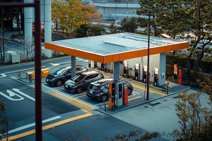 一个高角度俯拍的新能源汽车充电站,多辆汽车停靠,周围环绕着城市建筑。